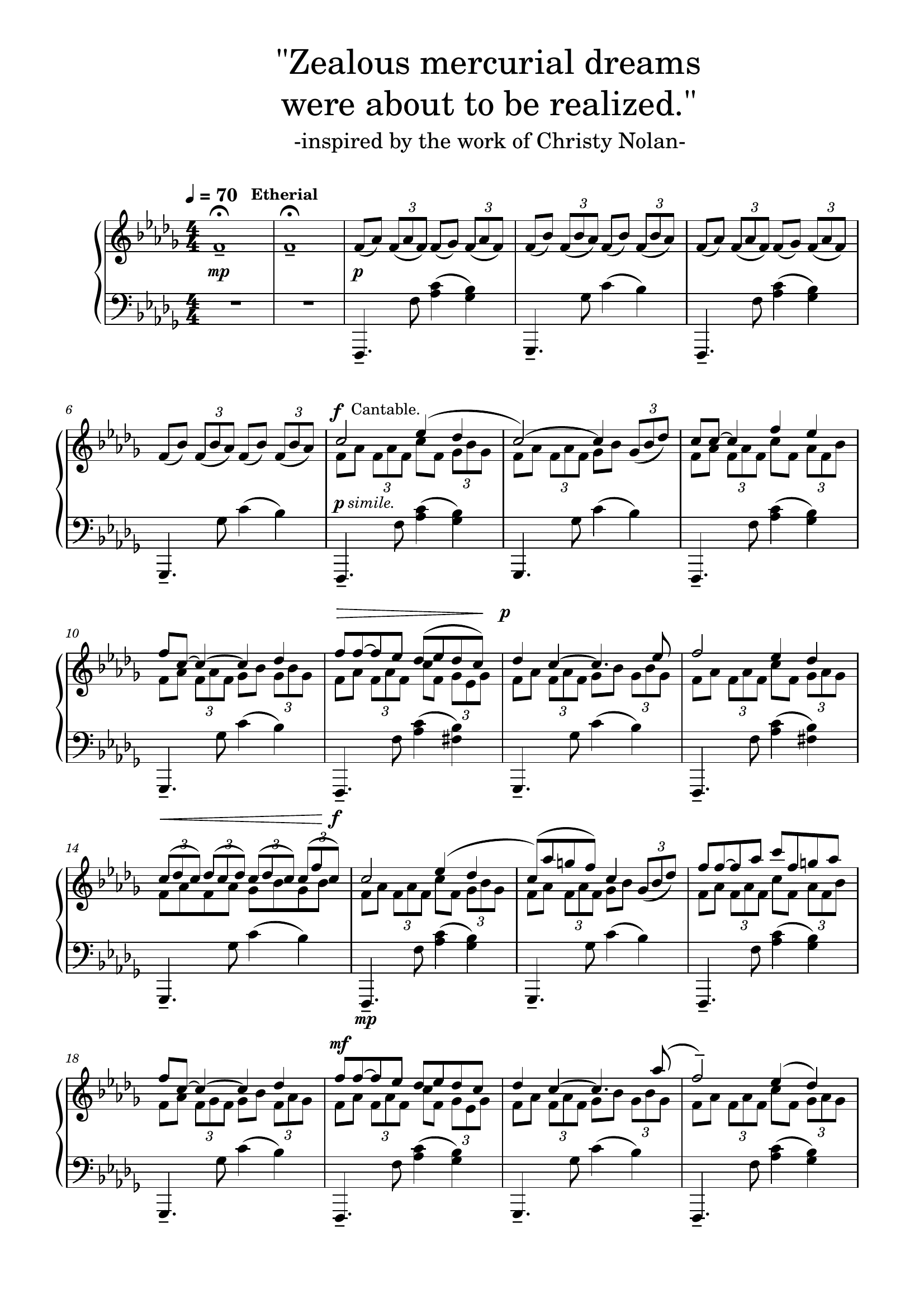 Description: This submission presents the musical score titled “Zealous mercurial dreams were about to be realized”, inspired by the work of Christy Nolan.